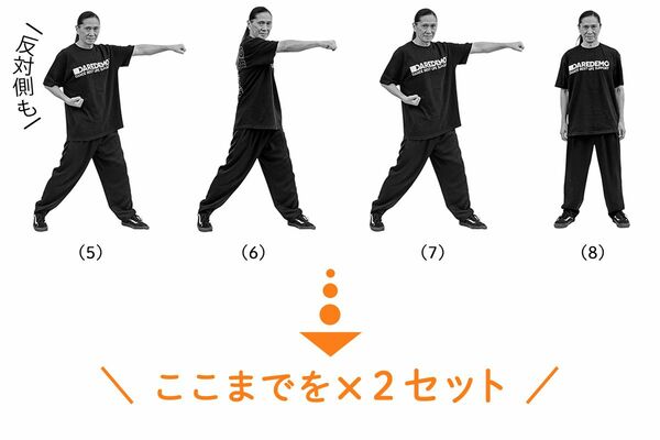 (4)正面に向き直り、まっすぐ立った状態に戻る