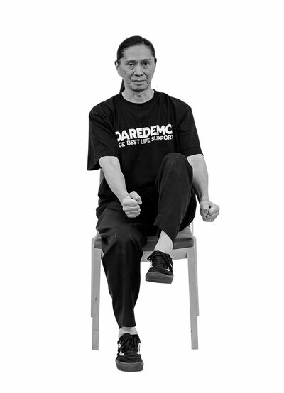 背もたれに背をつけて座り、片足ずつもも上げする。できる人は手もつけて
