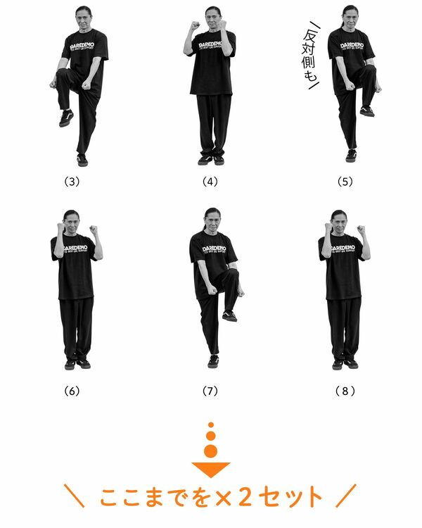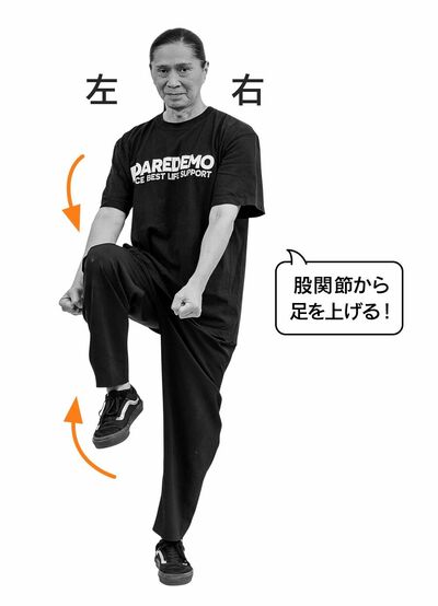 膝を上げようとするのではなく、股関節と、その周辺の腸腰筋で引き上げることを意識するのがポイント。腸腰筋は上半身と下半身をつなぐ筋肉で、この部分を鍛えると体幹が安定。股関節の動きが改善され、転倒予防にも