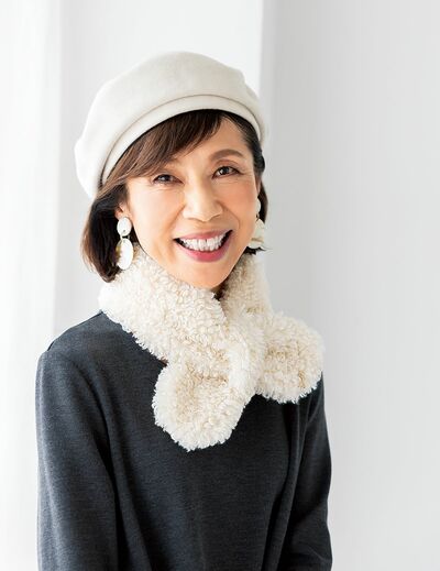オフホワイトの帽子とマフラーは、レフ板効果で顔まわりがパッと明るく