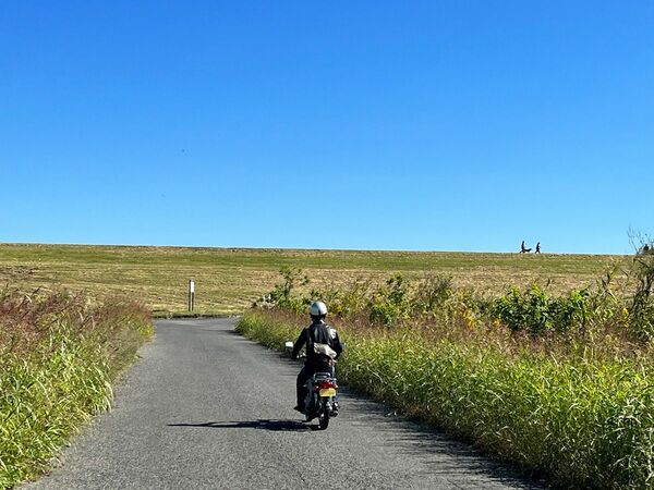 渡良瀬川へ向かう道。堤防の上には犬を散歩させる人の姿も