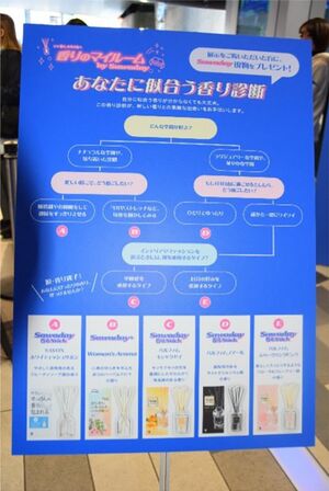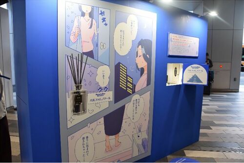 今回、発売50周年を機に、初の体験型イベントを実施。キンモクセイやシャボンなど、5種類の香りの体験ブースが設置され、それぞれにインスパイアされた女性たちの暮らしを描いた漫画風グラフィックと部屋のミニチュアを展示。訪れた人たちはブースを回って香りを体験し、一番気に入ったものに投票しました。また、“香り迷子”のために、どの香りがぴったりかを提案する診断コーナーも設置。