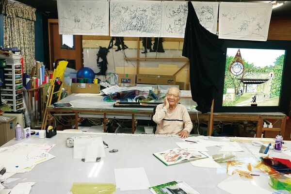 1963年に建てられたというアトリエ。縦2メートル、横3メートルの巨大ライトテーブルが藤城さんの創作の場。机の上には制作中の作品や資料、下書き、カラーフィルムなどが置かれている。藤城さんの右奥にあるのは、7月に現地でスケッチした美術館入り口の影絵作品