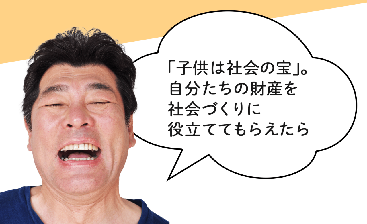 たとえば「遺贈寄付」。これは、自分が亡くなった後に財産の一部を公益法人やNPO団体等に託し、社会貢献につなげてもらうこと。昔から「子は社会の宝」やと言います。自分たちの財産を、未来を担う子どもたちが安心して暮らせる社会づくりに役立ててもらえたら、こんなに嬉しいことはありません。