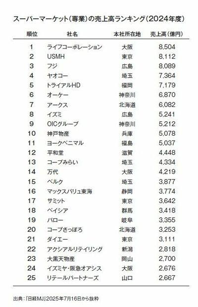 スーパーマーケット専業では、近畿圏と関東圏を地盤とするライフコーポレーションが首位に立つ。そしてイオン傘下のユナイテッド・スーパーマーケット・ホールディングス(USMH)が2位。