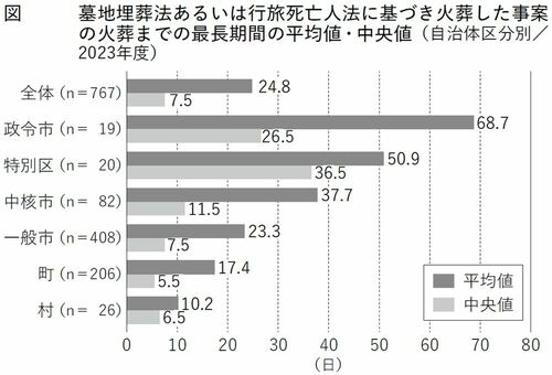 とくに都市部の自治体の負担が大きく、図のとおり、火葬までの期間にもばらつきがあります。