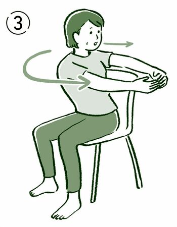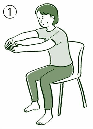 (1)「基本の座り方」で椅子に座り、両腕で大きなボールを抱えるようなポーズをとる。