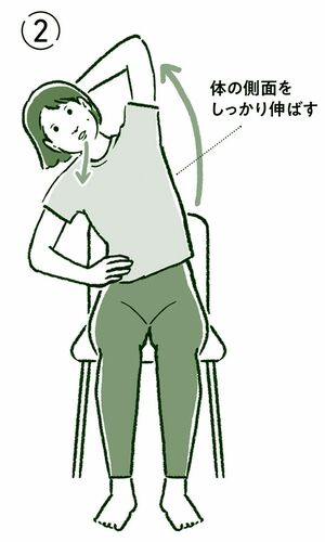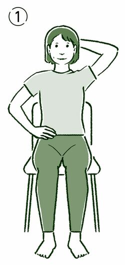 硬くなった肋間筋を刺激する《わきほぐしストレッチ》 (1)「基本の座り方」で椅子に座り、左手のひらを後頭部につける。右手は腰の位置に。 (1)左手のひらを後頭部に。右手は腰の位置に すべての写真を見る (2)息を吐きながら体を右へ倒す。少し息を止め、鼻から息を吸いながら(1)に戻る。反対側も同様に。1セット1分。 (2)息を吐きながら体を右へ倒す