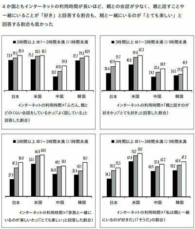 その結果、日本、アメリカ、中国、韓国の4か国とも、インターネットの利用時間が長いほど、親との会話が少なく、親と話すことや一緒にいることが「好き」と回答する割合も、親と一緒にいるのが「とても楽しい」と回答する割合も低くなっていました。