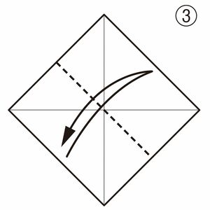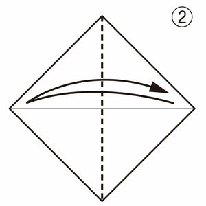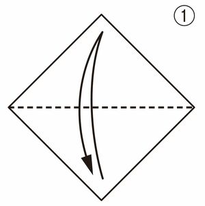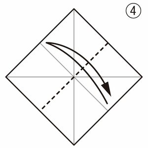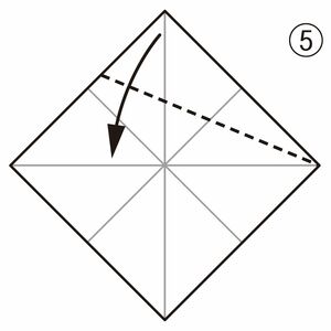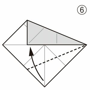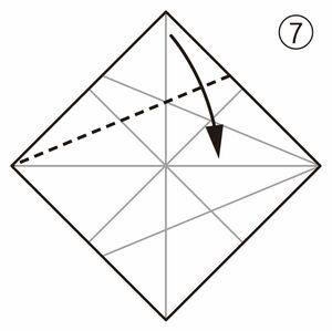 6)下の角を中心線に合わせて斜め半分に折り、上下に開く
