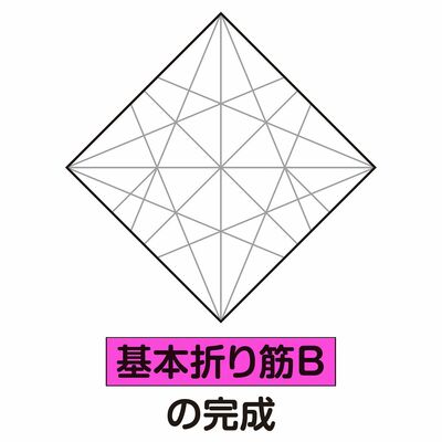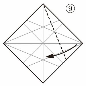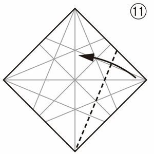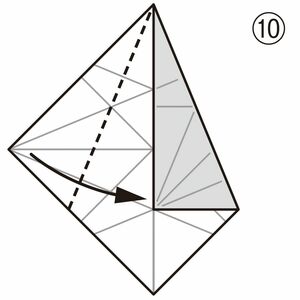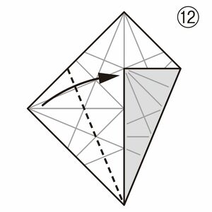 10)左の角を中心線に合わせて斜め半分に折り、左右に開く