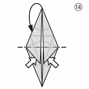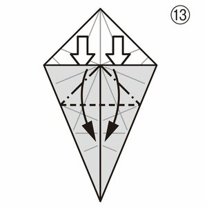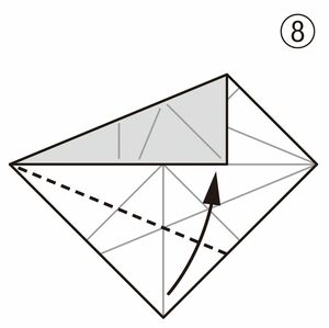 8)下の角を中心線に合わせて斜め半分に折り、上下に開く