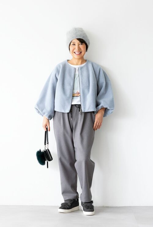 ブルージャケット¥20,900/セモア プリントカットソー¥18,700、パンツ¥28,600/ともにKEI Hayama PLUS 帽子¥13,200/グラヴェール(ムーンバット) イヤリング¥3,850/LIMITED NUMBER(お世話や) バッグ¥27,500/セラッチ ジャポン スニーカー¥23,980/マッキントッシュ ロンドン(モーダ・クレア)