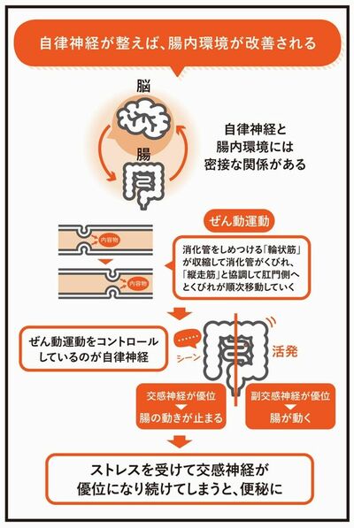血管と同じように、腸も自律神経のバランスが大切で、実際に便秘外来を受診した患者さんを調べると、たいてい自律神経に大きな偏りがあって、腸の運動機能が低下しています。