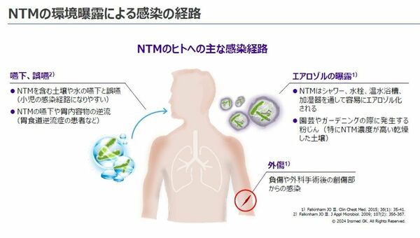NTMは結核菌と同じ抗酸菌に属する菌ですが、結核とは異なり、人から人への感染はないとされています。結核菌は人間など動物の体内でしか生息することができない一方、NTMは環境生育菌であり、都市の給水システムなど身近な場所に生息しています。