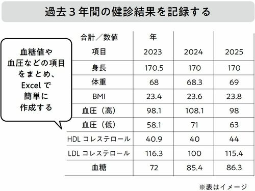 そして、その記録を医師に相談するときに持参することです。記録方法としては、直近3年間分の健診データをもとに作成するのがよいでしょう。もし可能であれば、何年前から高血糖、高血圧、脂質異常を指摘されているかがわかるだけでもいいです。