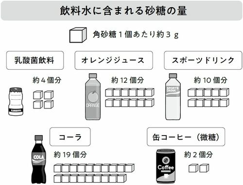 角砂糖1個を約3gとして計算すると、一般的に知られる500mlペットボトルのスポーツドリンクに含まれる角砂糖は、約8~10個。コーヒーを飲むときに角砂糖を2個入れるなどのレベルではありません。ちなみに、コーラは約19個です。