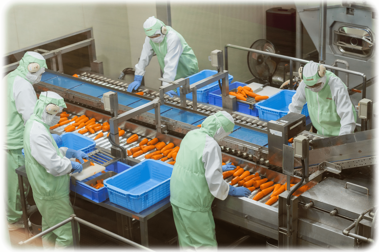 皮をむかれて次々と流れてくるにんじん。機械で処理しきれない汚れなどを、人の目で再度チェックして選別する