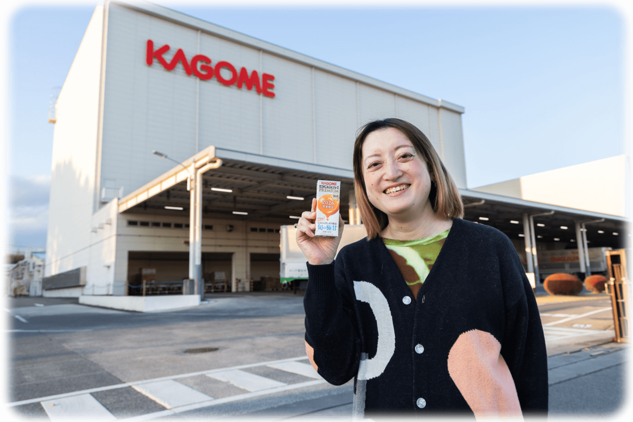 カゴメの製造工場前で笑顔の能町さん。「目の前で毎日飲んでいるジュースが作られると思うと、感動です」