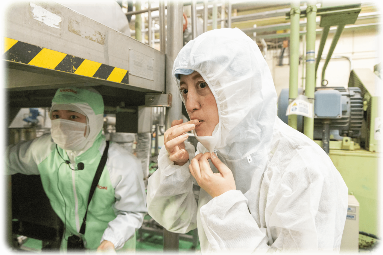 茨城県出身の能町さんは、牛久のロケ現場に当日実家から登場、カゴメの契約農家である阿部さんの畑で同窓生トークに花を咲かせた後、実際ににんじんを畑から抜き、その後栃木の工場へ移動して工場内部を見学。まさに第1回目のラインで生産されたばかりの「カゴメにんじんジュースプレミアム」2026年版を試飲しました。