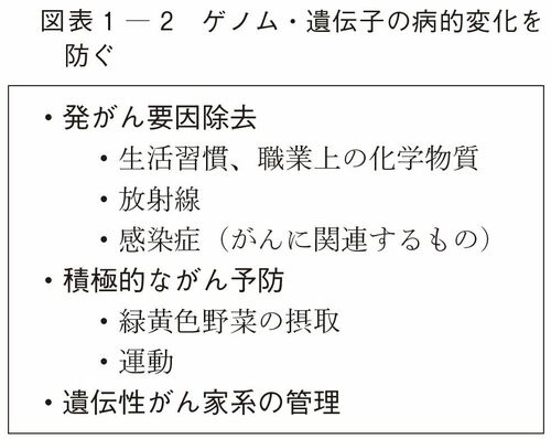 そこで、図表1-1に示した様々な発がん要因を念頭に、ゲノム・遺伝子の病的変化を防ぐために、図表1-2のような取り組みが勧められる。