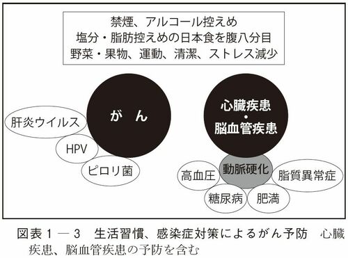 図表1-3では、より具体的に、生活習慣や感染症対策によるがん予防を説明している。これらの対策は、がんのみならず、心臓疾患や脳血管疾患の予防にもつながることをあわせてお伝えしたい。