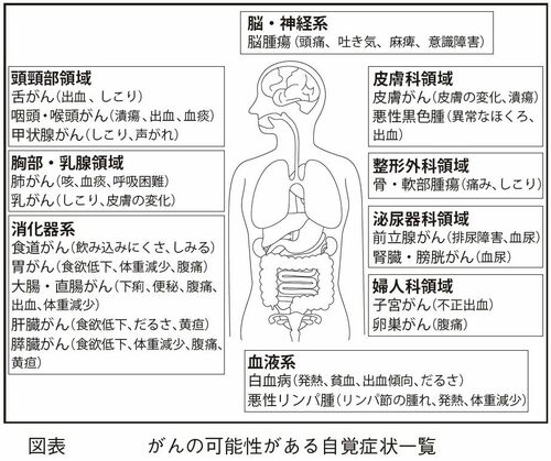日常診療でがんが見つかる第二のきっかけは、患者が訴える自覚症状である。健康管理に生かすために、がんに関わる自覚症状を下図表にまとめてみた。
