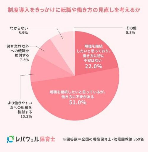 また、「より働きやすい園への転職を検討する(10.3%)」や「保育業界以外への転職を検討する(7.5%)」と回答した人も一定数おり、制度が今後の就業状況に影響を及ぼす可能性が示されました。
