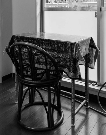 さらに、退院後に新たに購入したものも。これまでは二脚のスツールに板をのせた低めの簡易テーブルを食卓代わりにしていましたが、足が不自由になったため、座ったときに足を入れて伸ばせるテーブルに買い替えました。