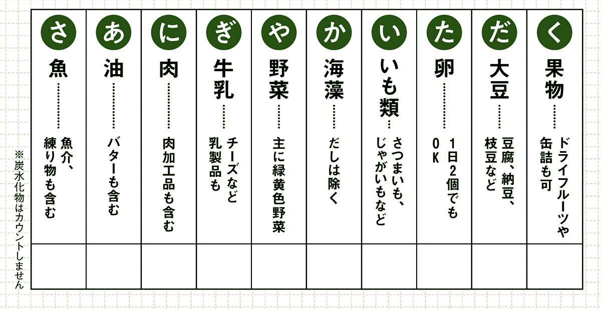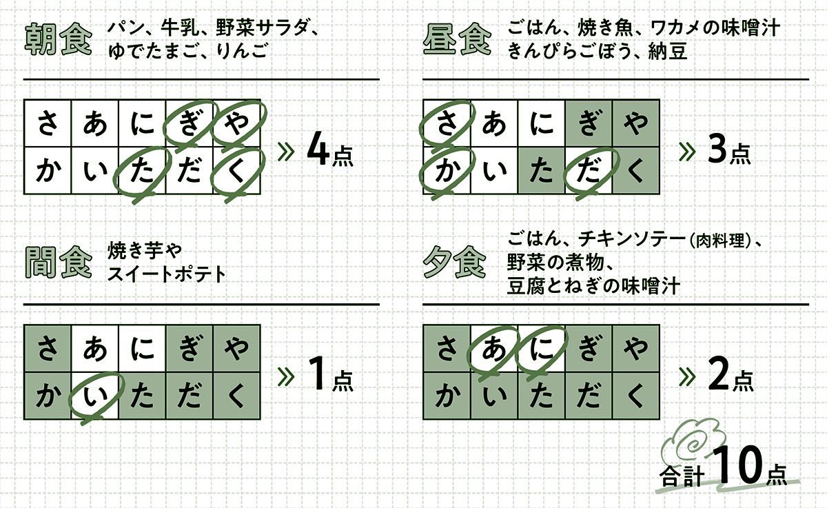 該当するものを食べたら枠の中に「○」を記入し、1点と計算します。2回目以降は加算しません。1日ですべての枠が埋まり、○が10個(=10点)になるようにバランスよく献立を考えてみましょう