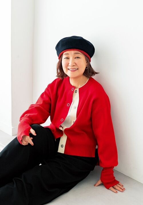 赤リブニットベレー¥15,400/coeur・クール(ジュイエ) 赤カーディガン¥19,800、Tシャツ¥14,300/ともにDUE deux パンツ¥31,900(2月発売)/ラ フェット デ タバサ(パパス) イヤリング¥2,860/LIMITEDNUMBER(お世話や)