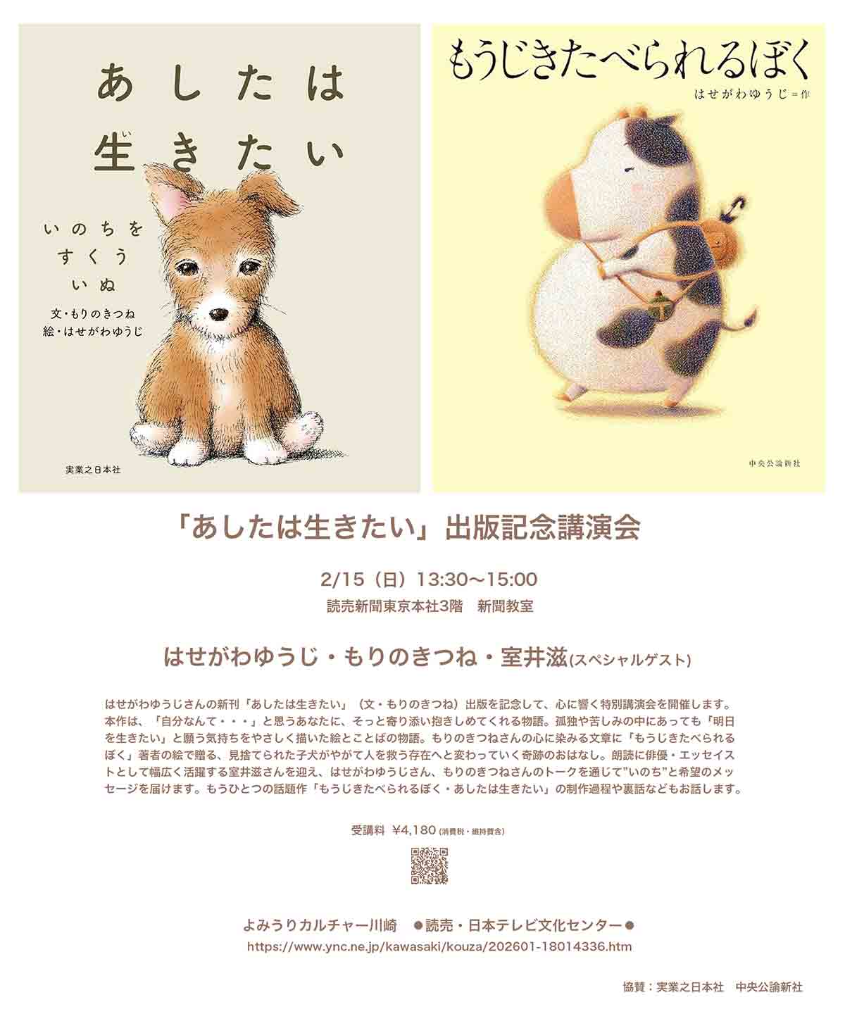『もうじきたべられるぼく』(中央公論新社刊)の著者、はせがわゆうじさんの新刊『あしたは生きたい』(文・もりのきつね 実業之日本社刊)出版を記念して、心に響く特別講演会を開催します。本作は、「自分なんて…」と思うあなたに、そっと寄り添い抱きしめてくれる物語。孤独や苦しみの中にあっても「明日を生きたい」と願う気持ちをやさしく描いた絵とことばの物語。もりのきつねさんの心に染みる文章に『もうじきたべられるぼく』著者の絵で贈る、見捨てられた子犬がやがて人を救う存在へと変わっていく奇跡のおはなし。朗読に俳優・エッセイストとして幅広く活躍する室井滋さんを迎え、はせがわゆうじさん、もりのきつねさんのトークを通じて”いのち”と希望のメッセージを届けます。『もうじきたべられるぼく』『あしたは生きたい』の制作過程や裏話などもお話します。