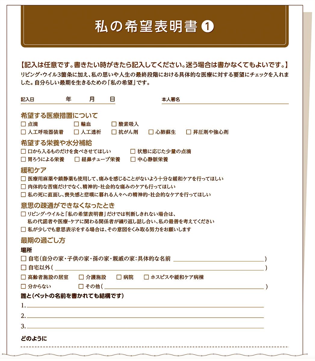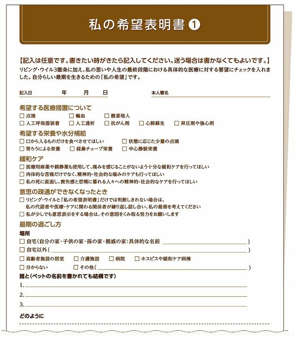 日本尊厳死協会発行のリビング・ウイル(人生の最終段階における事前指示書)を補完する「私の希望表明書」には(1)と(2)があり、ともに日本尊厳死協会のHPからダウンロードできる。(2)では「私が大切にしたいこと」に関して「医療・ケアについて」など6項目を選択式で記載できる。自由記述欄も