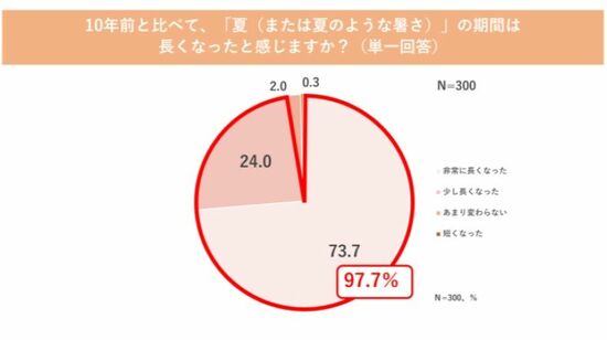 さらに、97.7%の人々が「10年前と比べて、夏(または夏のような暑さ)の期間が長くなった」と感じていることも分かりました。