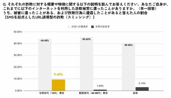 ネット詐欺の被害経験について全体平均を見ると、スミッシング被害は3.1%、フィッシング被害は3.4%といずれも3%程度に留まっています。しかし、属性別で詳しく見ると、令和世代(10代)男性の被害割合が突出して高い実態が明らかになりました。