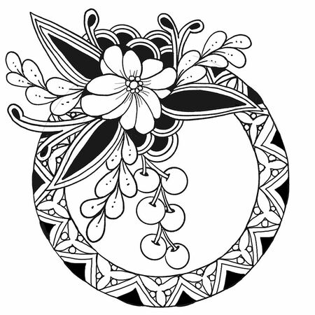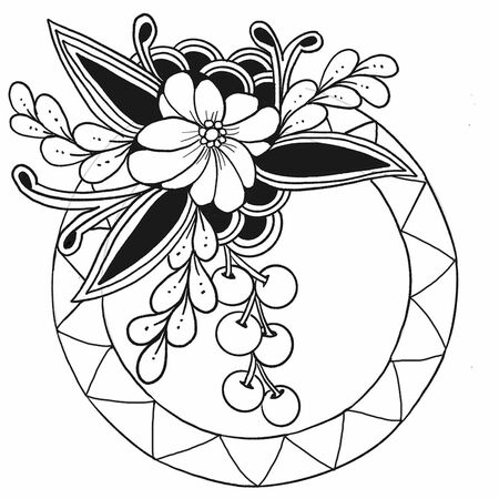 リングの内側にポークルート(F)を描きます。かんざしのようにかわいらしく。花飾りの部分を描き終えたら、リングの間を三角に区切ります。