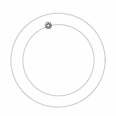 外側が直径15cmくらいの二重のリングを鉛筆で薄く描き、左斜め上あたりに花芯の飾りを描きます。位置が決まったらてまり(A)を。いびつになっても大丈夫。オリジナルの証です。