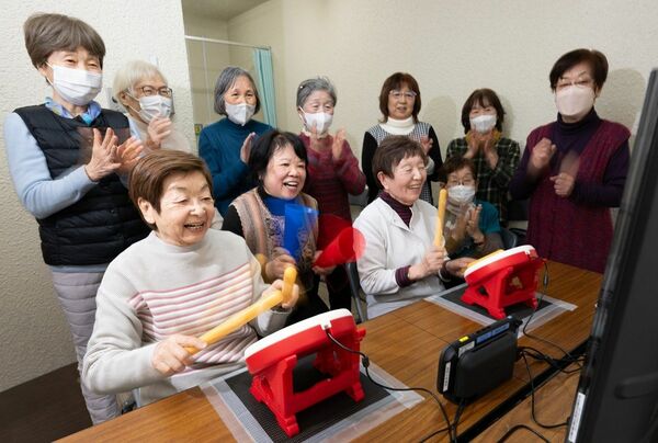 「狭くてごめんなさいね」と笑顔で迎えてくれたのは豊富(とよとみ)満子さん(90歳)。朝10時の開始に合わせて三々五々集まってきたメンバー11人で、すぐに部屋はいっぱい。奥の机にテレビ、太鼓とバチの形をしたコントローラー2台が置かれ、音楽と画面に合わせてリズムを取るゲーム、「太鼓の達人」が始まった。