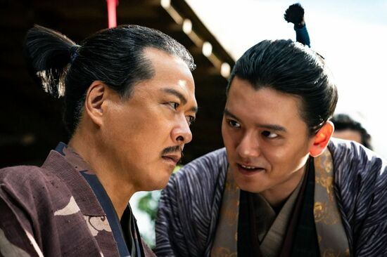天守閣から眺める織田の重臣たち。その中に藤吉郎・小一郎兄弟の姿も。