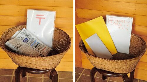 私の家のポストは、手作りです。大きなカゴを郵便受けにして〒と記した厚紙を置き、送りたい郵便物がある時は、それを裏返して、「郵便屋さん、投函してください」と書き入れて郵便物を入れておくと、届けるついでに、持って行ってくれます。遠いポストに投函しに行かなくてもいい。