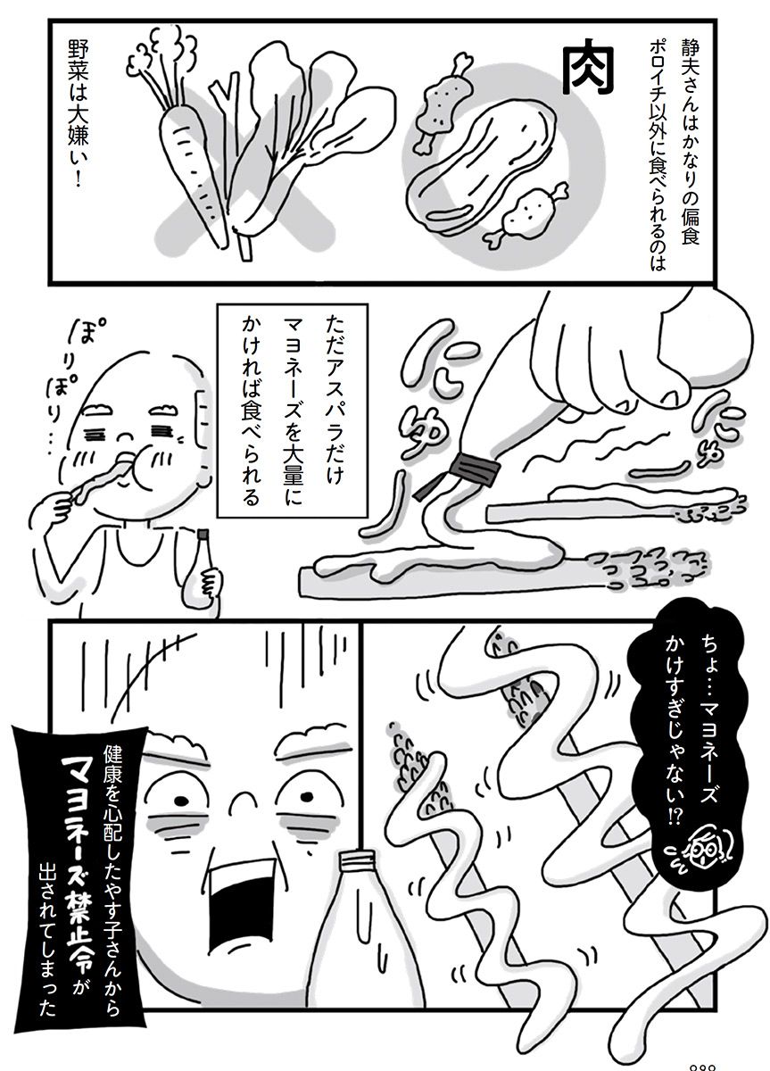 ナイツ・塙宣之 二世帯住宅で同居の義父「静夫さん」はかなりの偏食。唯一食べられる野菜、マヨネーズたっぷりのアスパラを義母に禁止され…【まんが】