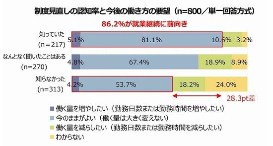 在職老齢年金制度の見直しを認知しているシニアの86.2%が「就業継続に前向き」と回答し、制度を知らない層との差は28.3ポイントに。制度の理解が進むことで、シニアの就業継続意欲がさらに高まる可能性が示されました。