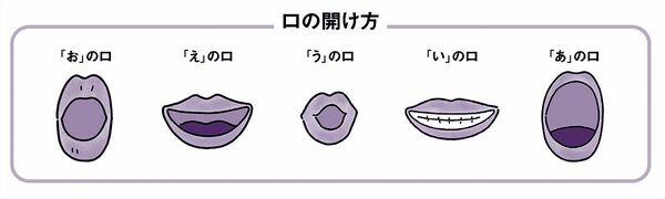 「あ」は指が2、3本入るぐらい縦に大きく開けます。「い」は小指が1本入るぐらいに開き、口角を左右の耳に寄せるイメージで。「う」は唇で小さな丸を作るようにすぼめ、少し前に突き出すように。「え」は唇をやや左右に引くようにして、指1本入るほど開けます。舌先はやや上向きで。「お」は唇に少し力を入れ、頬がややへこむようにします。