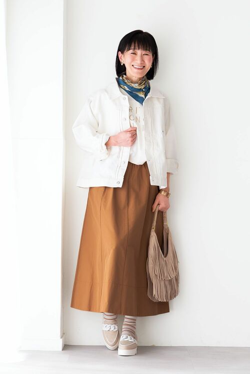 多少派手な柄のスカートやワンピースでも、デニムのカジュアル感となら相性がよく、若々しいコーディネートになります。