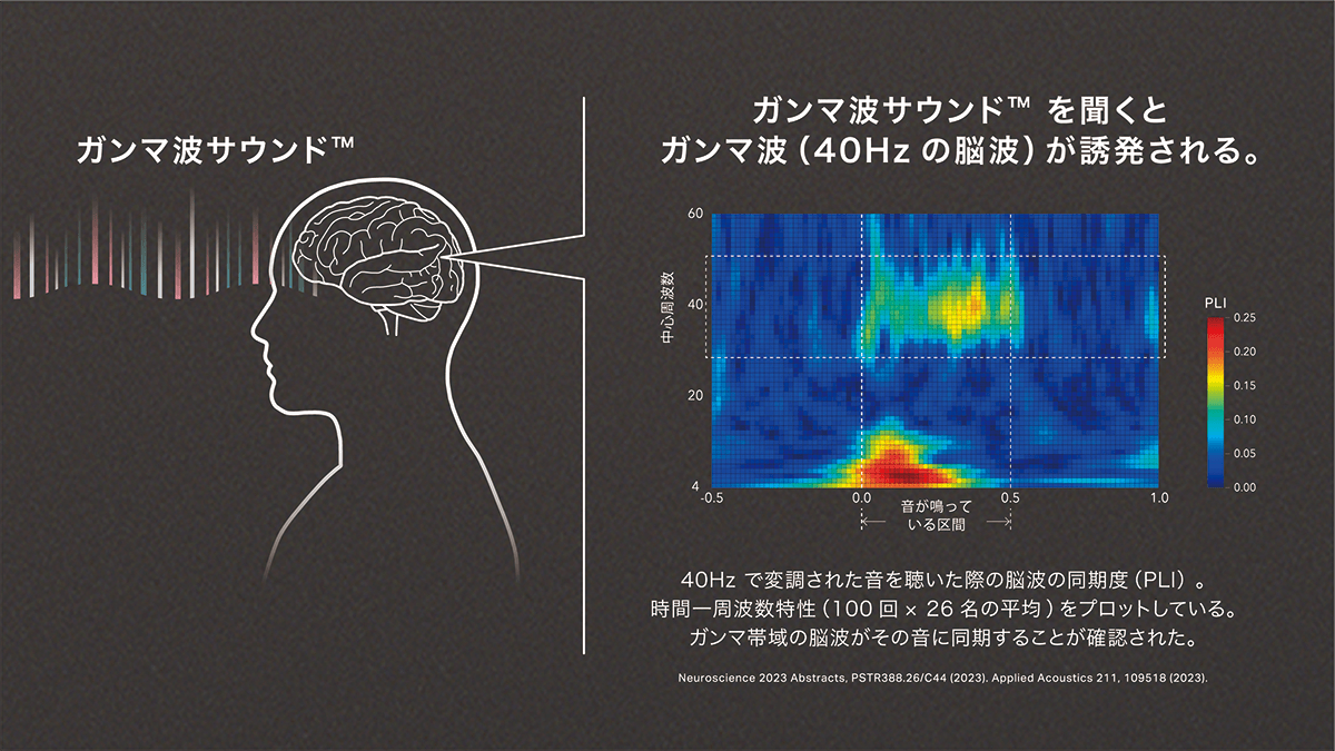 国内では、この論文に着目した塩野義製薬とピクシーダストテクノロジーズが、共同研究により、日常の音を40Hzに変調を施す「ガンマ波変調技術」で世界初の技術を開発し、特許を取得しました。その技術を用いて「ガンマ波サウンド™︎」が生まれました。アルツクリニック東京が運営する「健脳カフェ」(東京・四谷)では「ガンマ波サウンドルーム」にこのシステムを利用し、音の刺激による脳の神経細胞の活性化を期待しています。