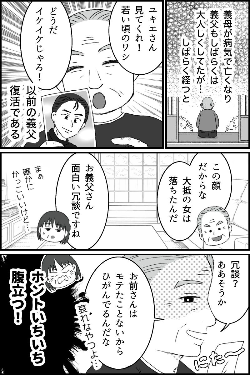 私は佐藤ユキエ、50代後半の専業主婦です。20代で結婚し、同時に夫の実家で義理の両親との同居を始めました。義父は近所でも評判の「女好きのトラブルメーカー」。義母が亡くなって、しばらくは気落ちしていた義父ですが、あっという間に元気を取り戻し、また女性とのトラブルを起こすように。まるで「やっと自由になった」とでも言わんばかり……