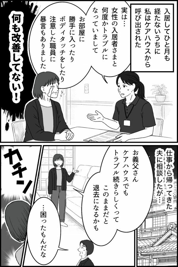 帰宅後、ケアハウスでの義父の様子を夫に話したところ、返ってきたのは「…困ったもんだな」という言葉。もう我慢の限界です。