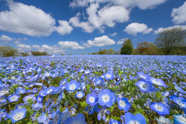 丘を覆い尽くす100万本のネモフィラと30万株の芝桜は西日本最大級。ブルーとピンクに染まる丘は写真映え抜群。6月からはあじさいも楽しめる