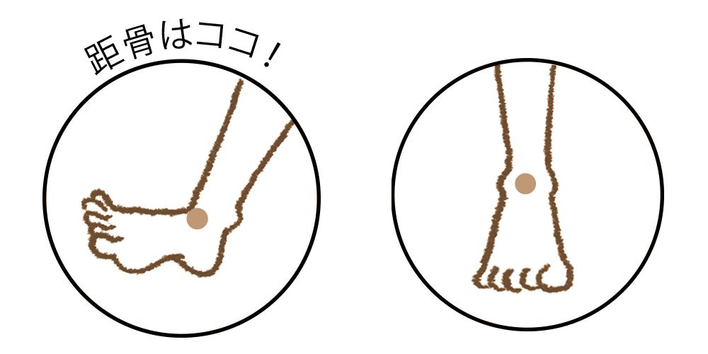 距骨は足首の前面、内くるぶしと外くるぶしを結んだ中間点にある。足首を上に曲げたときにできるくぼみが目印