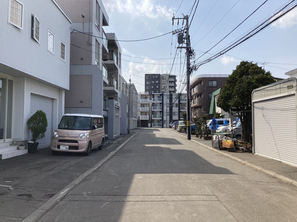 左手前の角が安藤さんが襲われた現場。突きあたりが救急搬送された病院。道の右、植え込み先の建物は地下鉄・新道東駅の入口(写真:『ドキュメント クマから逃げのびた人々』より)